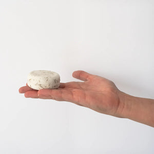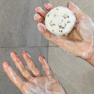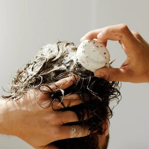 Masajea el champú sólido sobre el cabello húmedo. Dejar actuar por un corto tiempo y luego enjuagar bien.