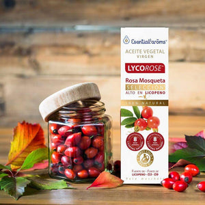 El Aceite Vegetal Rosa Mosqueta Lycorose Esential Aroms es un complemento alimenticio dentro de los superalimentos, con alta concentración en licopeno biodisponible, que además tiene beneficios cosméticos. Es un aceite vegetal virgen exclusivo por su alto contenido en licopeno natural, que es 8 veces más concentrado que el aceite vegetal de rosa mosqueta convencional.