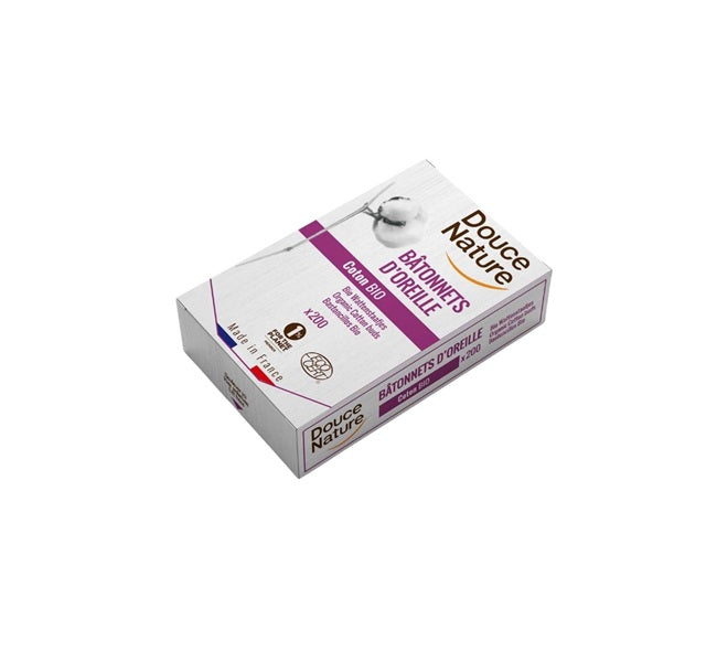 Los Bastones para el Oído de Algodón Bio de Douce Nature están diseñados para una limpieza suave, segura y respetuosa con el medio ambiente. Fabricados con 100 % algodón ecológico sin blanqueadores ni cloro, y con palito de papel biodegradable, son la alternativa sostenible perfecta a los bastoncillos convencionales de plástico.