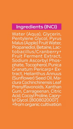 Water (Aqua), Glycerin, Pentylene Glycol, Pyrus Malus (Apple) Fruit Water, Propanediol, Betaine, Lactobacillus/Cranberry Fruit Ferment Extract, Sodium Ascorbyl Phosphate, Tocopherol, Punica Granatum Pericarp Extract, Helianthus Annuus (Sunflower) Seed Oil, Maclura Cochinchinensis Leaf Prenylflavonoids, Xanthan Gum, Carrageenan, Citric Acid, Cocoyl Proline, Caprylyl Glycol.