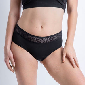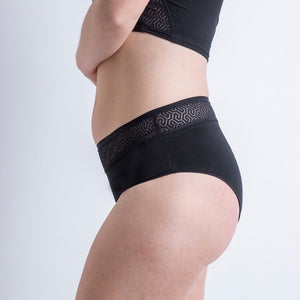 Braguita menstrual de corte clásico con un punto atrevido que se adapta cómodamente al cuerpo. Su elasticidad es suave y agradable. MOERI es un paso más hacia la sostenibilidad: la cinturilla contiene un 60% de material reciclado (poliamida y elastano), zona del puente es de algodón orgánico.
