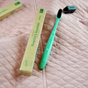 Dedicado a la higiene bucodental, este cepillo tiene un mango elaborado de plástico 100% reciclado y es reciclable. Además, las cerdas están hechas a base de compuestos vegetales y nylon, para luchar contra la proliferación de bacterias. El cepillo viene con un capuchón protector.