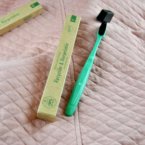• El cepillo viene envuelto en un embalaje compostable. El estuche está hecho 100% a base de cartón reciclado y tinta a base de vegetales.