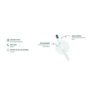 • El cepillo viene envuelto en un embalaje compostable. El estuche está hecho 100% a base de cartón reciclado y tinta a base de vegetales.