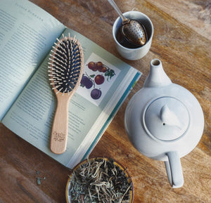 Cepillo grande ovalado con alfileres regulares, 8,66 "de largo, 2,36" de ancho (22 x 6 cm). Fabricado en madera de fresno certificado FSC 100%, mango tratado con aceite de linaza y cera de carnauba vegetal; púas regulares en madera de carpe FSC 100% certificado, 0,71 "de largo; cojín de caucho negro puro. Producto certificado Vegan OK.