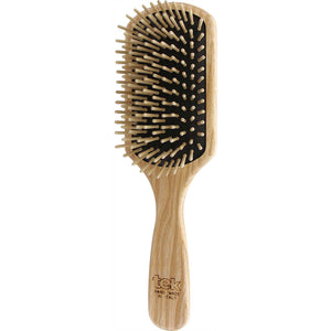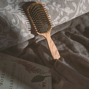 Cepillo de paleta con púas cortas. Fabricado en madera de fresno natural 100% certificado FSC. Púas fabricadas en madera de carpe 100% con certificado FSC, caucho puro negro. Este cepillo es ideal para cabello medio o largo. Antiestático - Hecho a mano en Italia.