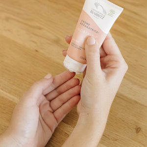 La crema de manos orgánica repara manos sensibilizadas, irritadas o muy secas tras diversas crisis (frío, sequedad, lavados frecuentes, etc.). Después de su aplicación, las manos se calman instantáneamente y recuperan flexibilidad y suavidad. Gracias a su fórmula rica y aislante, la crema de manos orgánica fortalece la película hidrolipídica y forma una barrera protectora. Su fórmula hipoalergénica 2  contiene Alga-Sendatu®. Este activo reparador  patentado 1 de origen natural, derivado de algas rojas que se lava de forma natural en la Costa Vasca, favorece la reconstrucción de las capas superficiales de la piel.