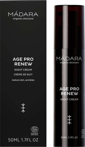 La Crema de Noche Renew Age Pro de MÁDARA es un tratamiento intensivo diseñado para pieles maduras, secas o apagadas que necesitan restaurar su vitalidad durante la noche. Con una fórmula avanzada de cosmética natural, combina el poder de la savia de abedul nórdico, micro y macroalgas reafirmantes y fitosteroles vegetales para apoyar las funciones regenerativas de la piel a partir de los 45 años.