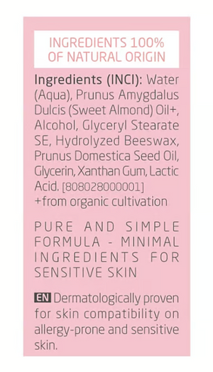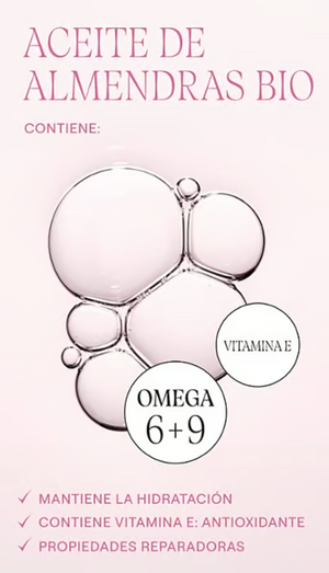 • Ingredientes 100% naturales: Aceite de almendra dulce (calma y cuida las pieles más sensibles y las protege de la pérdida de hidratación), aceite de hueso de ciruela (alta concentración en ácidos grasos insaturados y antioxidantes) y ácido láctico (retiene la humedad y suaviza la piel; de origen vegetal).