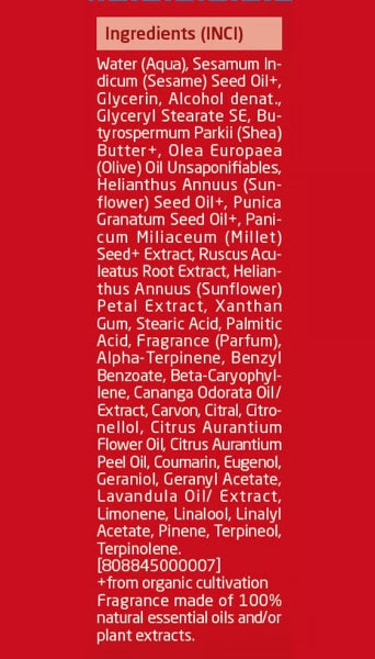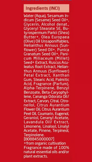 Water (Aqua), Sesamum Indicum (Sesame) Seed Oil, Glycerin, Alcohol, Glyceryl Stearate SE, Butyrospermum Parkii (Shea) Butter, Olea Europaea (Olive) Oil Unsaponifiables, Helianthus Annuus (Sunflower) Seed Oil, Stearic Acid, Punica Granatum Seed Oil, Panicum Miliaceum (Millet) Seed Extract, Ruscus Aculeatus Root Extract, Helianthus Annuus (Sunflower) Petal Extract, Xanthan Gum, Fragance (Parfum*), Limonene*, Citronellol*, Benzyl Benzoate*, Geraniol*, Citral*, Eugenol*, Coumarin*.