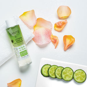 Con extracto de pepino, aceites BIO, aloe y agua de rosa.