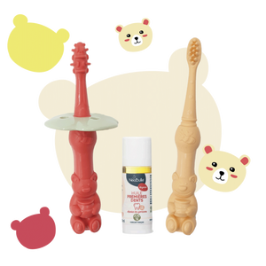 Este kit para aliviar la dentición incluye 2 cepillos, Bavouille y Mâchouille, un anillo de seguridad y un aceite calmante para los primeros dientes.