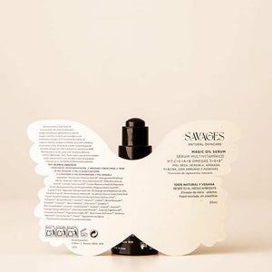 El Magic Oil Serum Savages Bio Cosmetics es un sérum facial multivitamínico 100% natural y vegano que aporta un tratamiento intensivo e integral para una piel más luminosa, firme y equilibrada. Su exclusiva sinergia de vitaminas C, E, A y B, junto con omegas 3, 6 y 9, nutre profundamente, refuerza la barrera cutánea y estimula los mecanismos naturales de juventud de la piel.